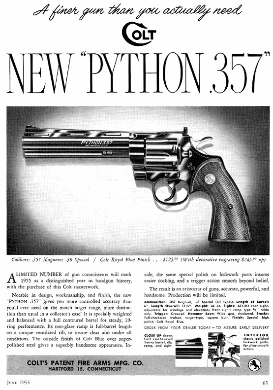 How much did a Python cost in 1955? You could purchase the handsome Royal Blue model for just $125.00! Factory-engraved models started at $245.00, according to this Colt advertisement from June, 1955: