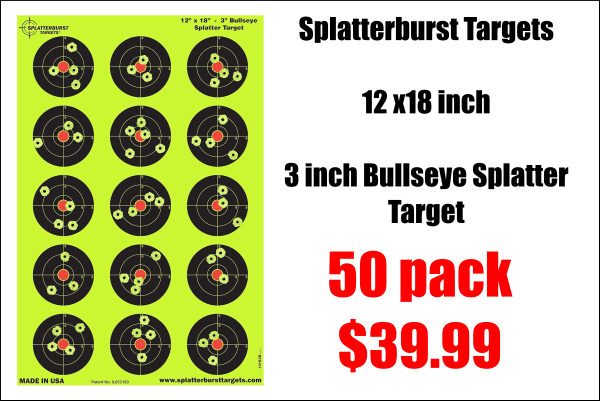 Splatterburst Targets make spotting bullet impacts easy, with hi-viz, bright yellow shot marks. With fifteen 3″ bullseyes, this Splatterburt target sheet is great for rimfire or centerfire practice. And you can see bullet impacts out to 400 yards. And right now you can get FIFTY (50) of these 15-bull target sheets for just $39.99 on Amazon (#ad) — that’s just 80 cents per target sheet. The BRIGHT yellow bullet holes are visible in all light conditions, great for people with weak vision.