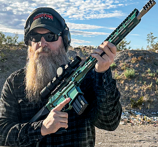 THE SECOND RIFLE Bishop sent me to run was their 458 SOCOM Hammer MK II. Like their bolt-action, this rifle was also introduced at SHOT Show in 2019, and has had a few revisions. And just like its sister, this AR has a 16-inch EV-5 match grade barrel by Tactical Ordnance. The Elftmann match-adjustable trigger can be set from 2.75 to 4 pounds. An adjustable gas block is now standard to help the user adjust the harmonics of the barrel for optimum accuracy. What’s unique about this AR is the billet Gibbz Arms side charging handle. Yep, you read that right; the charging handle is located on the left side of the rifle instead of the standard top charging handle on most AR platforms. Each rifle is also fully configurable by the purchaser to create it to their own requirements.