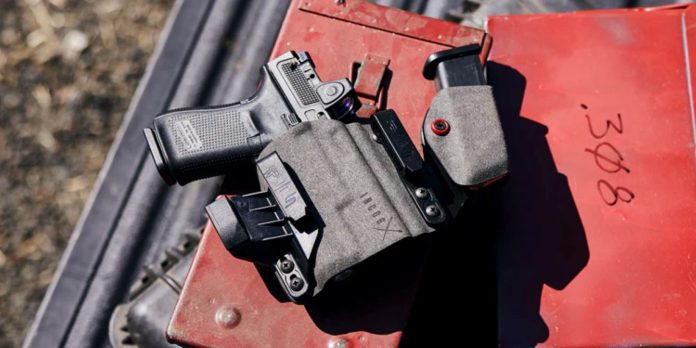 The handgun’s handle lies across the appendix region when carrying in the standard AIWB position. Speed is excellent. Don’t rush to the handle and draw. Run the hand up from under the handgun and scoop it from the holster on the way up. If seated the hands may practically set on top of the handgun with no one the wiser. An advantage often overlooked is that retention may be enhanced as the wearer may have both hands available to parry an attack.
