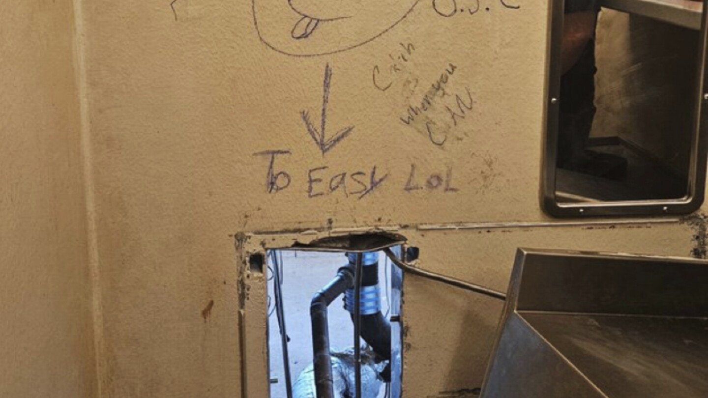 The inmates breached a wall behind a toilet — a blind spot not visible from the control module — and entered a maintenance corridor, the sheriff’s office said. At approximately 1:01 a.m. on May 16, the inmates exited through a loading dock door, scaled a wall and fled the property. Surveillance video confirms the inmates crossed the interstate shortly after.
