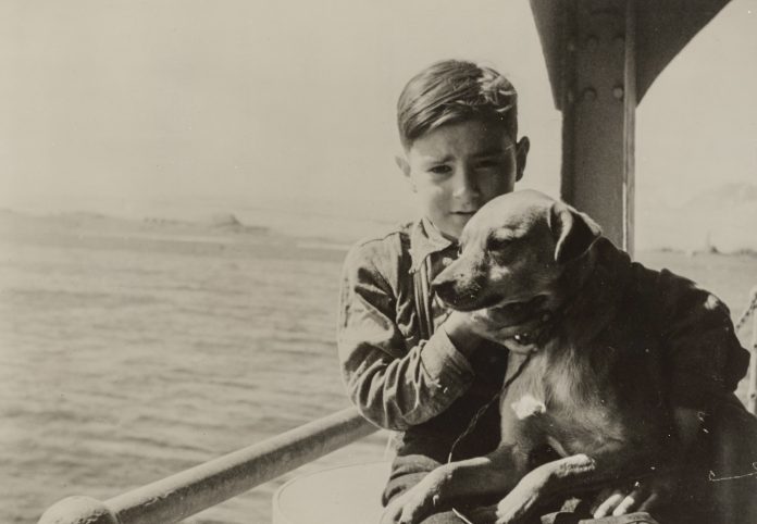 This Aleut child and his dog are repatriated to the islands after the war. Many Aleutians were evacuated from the islands in the early days of World War II. Image: U.S. Coast Guard