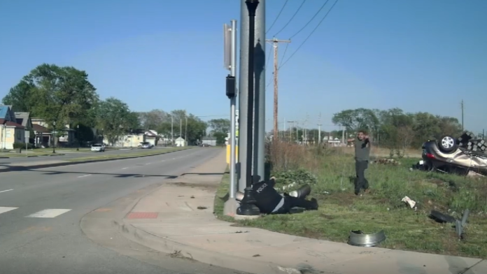 The pursuit ended near Dearborn and Gostlin streets, where the suspect crashed and exited the vehicle. Bodycam video shows officers approaching him in a nearby field, where authorities say the suspect produced a firearm and shot at police.