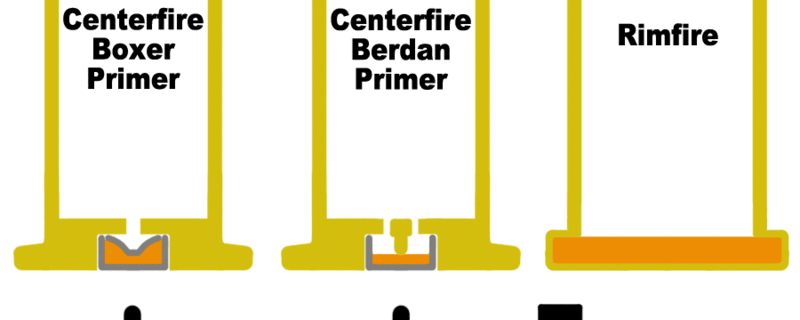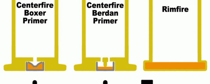 There are two common types of centerfire primers — Boxer and Berdan. This helpful Wikipedia illustration shows how Boxer, Berdan, and rimfire primers ignite the powder in the cartridge: