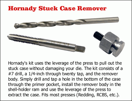 If you do stick a case in your die there are a few good stuck case removal kits available. Each one works in a similar fashion. I have found the Hornady kit very effective and easy to use. [Editor: Forster, Lyman, and RCBS also make good kits for removing a case stuck in a die.]