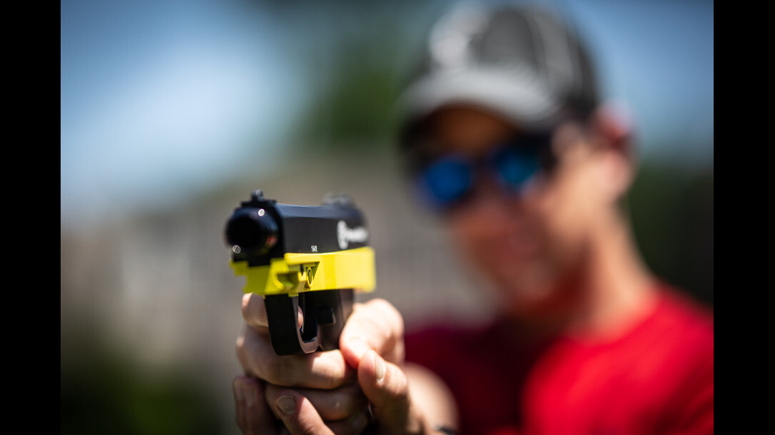 The Pepperball TRP is highly comparable to an average semi-automatic handgun in both design and feel. At just less than two pounds, it’s relatively lightweight for a comfortable carry. The pistol exhibited Pepperball’s signature yellow accents against the weapon’s black colored handle, trigger, and sights.