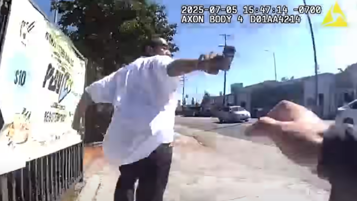 LOS ANGELES — Newly released body camera footage shows the events leading to a police shooting where a man shot at officers during a foot pursuit, KABC reported.