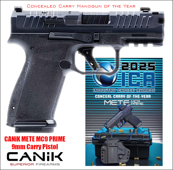 The compact CANiK METE MC9 PRIME pistol has been named the 2025 ICA (Industry Choice Awards) Concealed Carry Handgun of the Year. This compact single-stack 9mm pistol features a ported barrel and an optics-ready slide. Average retail price is $599.99.