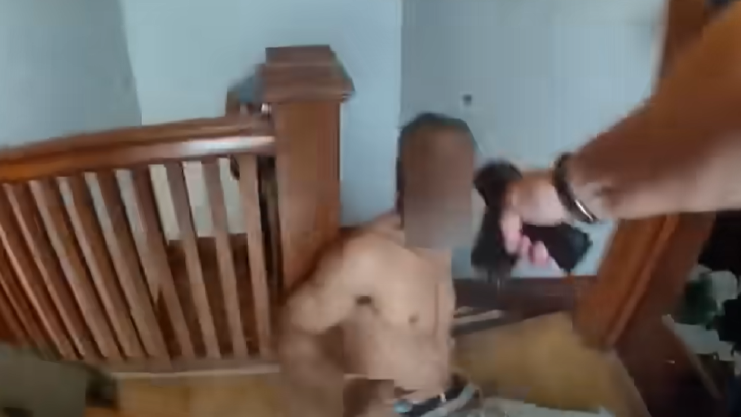 As officers yell at the man to drop the knife, the man swings at them. That’s when one of the police officers fired three shots at the shirtless man on the ground near the top of the stairs.