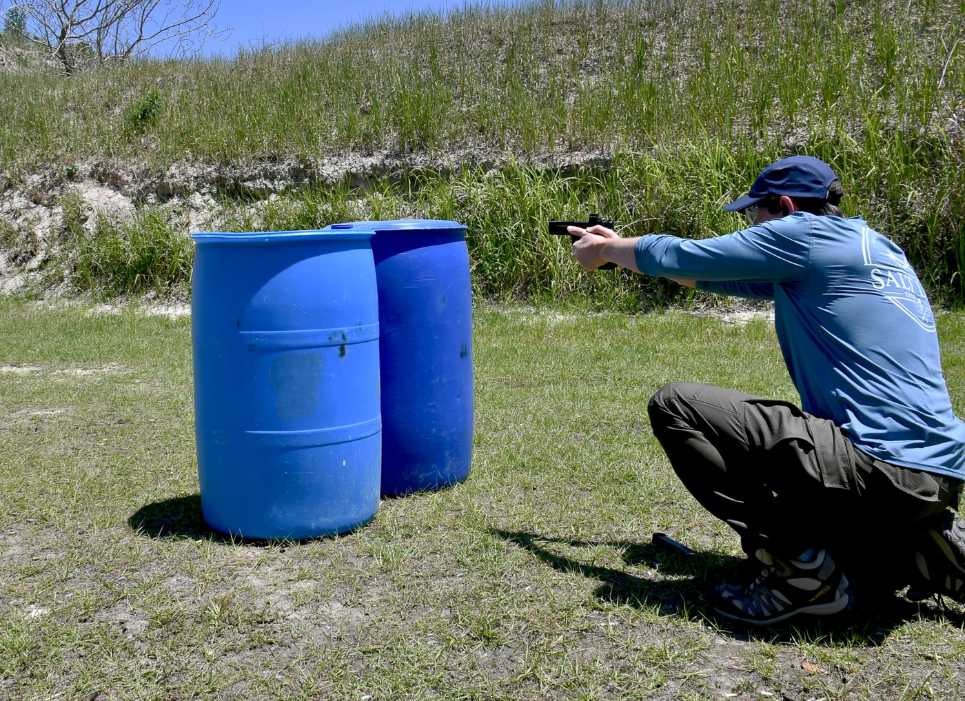 A man is shown on an outdoor range firing his handgun from an open position without nearby hard cover, demonstrating how to respond when shelter isn’t available. The image highlights rapid, accurate shooting and controlled recoil management under simulated stress. This scene relates to two self-defense shooting drills that teach both seeking cover and, when necessary, applying suppressive accurate fire while moving. Visible targets and clear lanes emphasize a controlled training environment where exposure and movement are practiced safely. The photograph underscores the balance between speed and precision when fighting from the open. It also reinforces basic safety: muzzle awareness, proper stance, and eye protection.