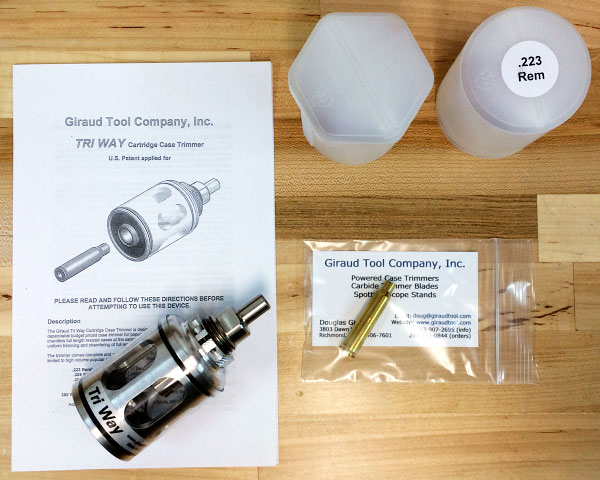 Giraud Tool offers a case trimmer/chamferer device that works with a power drill (or other power source). Giraud’s patented Tri-Way Trimmer is a self-contained unit powered by your drill or motor. Using a sharp carbide blade it will trim your cases to length, deburr, and cut both inside and outside chamfers — all in one pass. That’s pretty impressive for a $120.00 tool that fits in the palm of your hand.