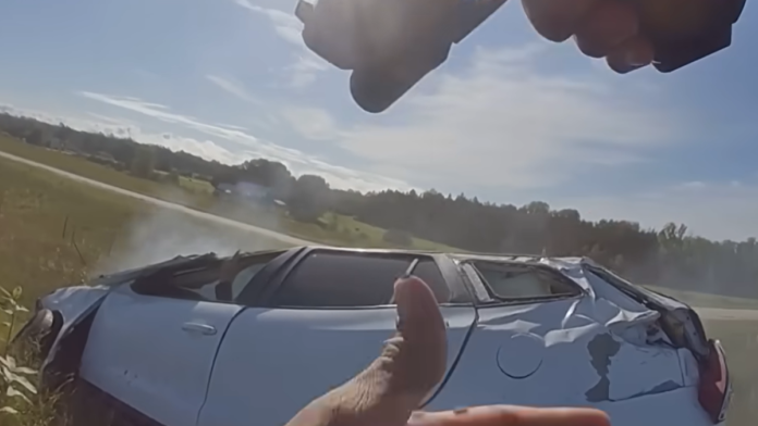 After the crash, officers ordered the suspect to exit the vehicle while approaching the driver’s side door. The man appeared to flip the officers off through the window, body camera footage shows.