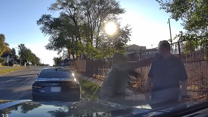 The footage then shows both vehicles pulling over several yards ahead. The man exits his car with his hand in his jacket pocket. The officer, not in uniform, also steps out. They meet at the front of the vehicles, where the man appears to accuse the officer of hitting his car.