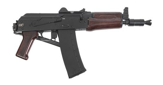 The Soviet Arms AKS-74U “Krinkov” pistol made by Palmetto State Armory is a modern incarnation of a classic Russian com-bloc weapon but with U.S. legal parts. It also is in the more common 5.56×45 rifle cartridge. It is categorized as a pistol that also has a folding “arm brace”.