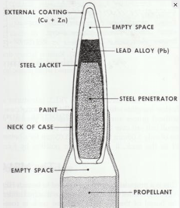 Let’s take a look at the traditional Soviet caliber for the AK74U. The 5.56X39mm is quite an interesting cartridge to study. My research turned up with bullet weights ranging from 53 grains to a subsonic version weighing 80 grains this little cartridge is lighter than the previous versions to carry on a march and quite lethal. In service since 1974, the construction of the cartridge is quite interesting. The unhardened 22.1 grain steel rod penetrator core is covered by a thin lead inlay which does not fill the entire point end, leaving a hollow cavity inside the nose. The bullet is cut to length during the manufacturing process to give the correct weight. The very lethal 7N6 version uses a boat-tail design to reduce drag and there is a small lead plug crimped in place in the base of the bullet. The lead plug, in combination with the air space at the point of the bullet, has the effect of moving the bullet’s center of gravity to the rear; the hollow air space also makes the bullet’s point prone to deformation when the bullet strikes anything solid, inducing yaw. That’s right, a rifle bullet that tumbles on impact! That makes for some really wild wounds that are certainly hard to treat.