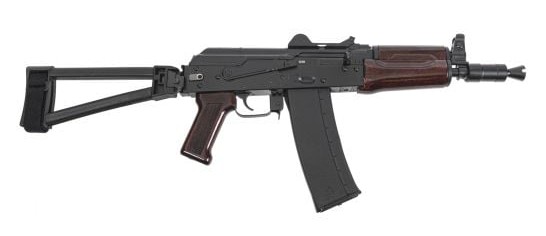 The Soviet Arms AKS-74U “Krinkov” pistol made by Palmetto State Armory is a modern incarnation of a classic Russian com-bloc weapon but with U.S. legal parts. It also is in the more common 5.56×45 rifle cartridge. It is categorized as a pistol that also has a folding “arm brace”.