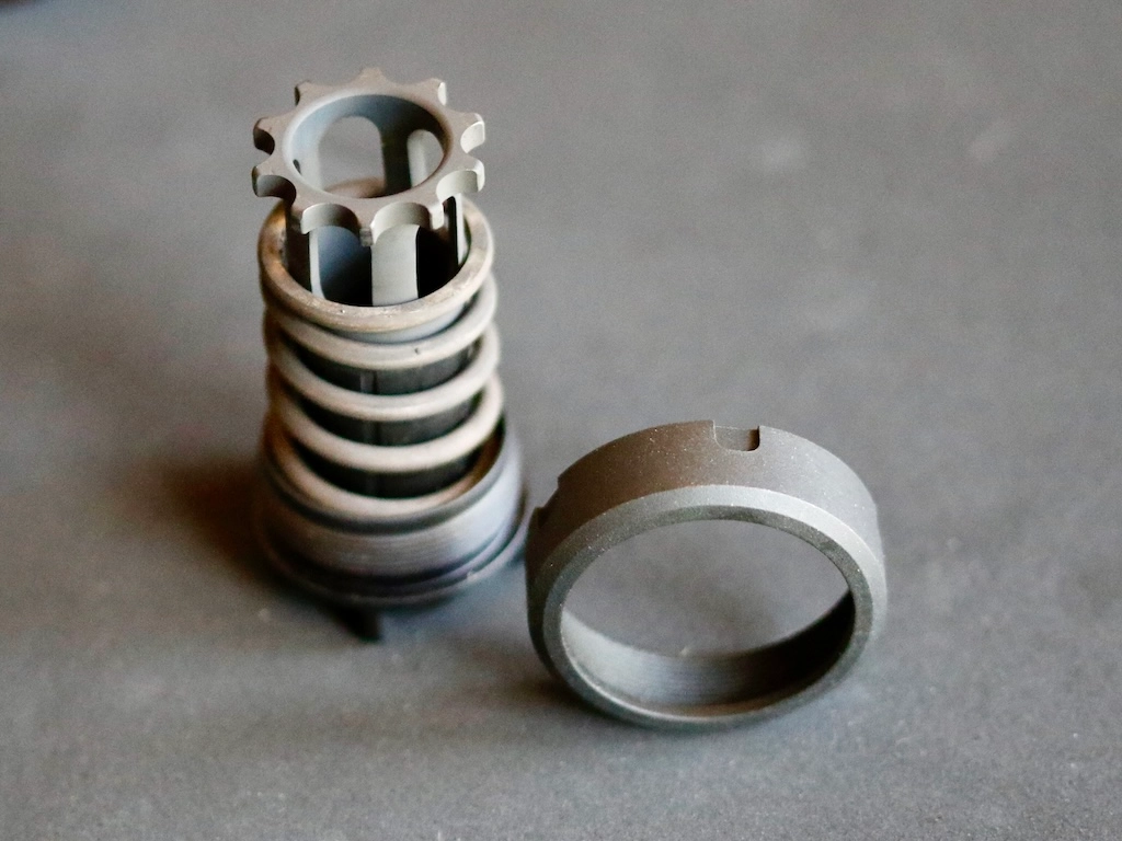 Adding a Nielsen Device (commonly called a piston) puts a spring between the body of the suppressor and the connector that threads onto the barrel. When the gun fires, the barrel is free to drive backward as intended. The connecting spring compresses a bit, which leaves the suppressor itself at rest, before all the compressed springs rebound and realign the barrel, slide, suppressor—everything.