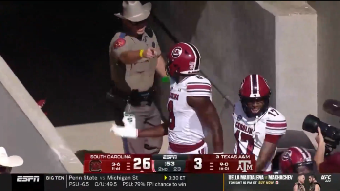 The trooper was seen on video making contact with South Carolina Gamecocks wide receiver Nyck Harbor and running back Oscar Adaway III after Harbor scored an 80-yard touchdown in the second quarter, KBTX reports. Harbor, who appeared to be limping as he entered the tunnel after the play, turned to rejoin his teammates when the trooper stepped toward him and made contact. The video then shows the trooper bumping both players before turning toward them, yelling and pointing a finger.