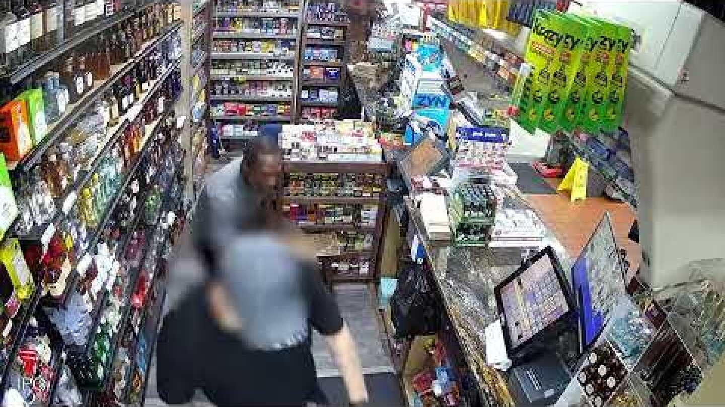 Video shows Harris hunkering behind the store’s counter, throwing items and occasionally pointing his gun in a side grip as two other employees, one of them also armed, extricate themselves from that area. He appears to barricade himself behind a shelving unit and a stool, crouching and pointing his gun from behind the makeshift bunker before jumping over the counter and allegedly taking aim at a female employee hiding near the freezers.
