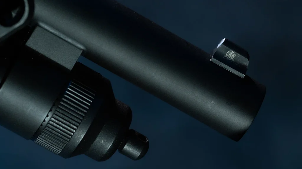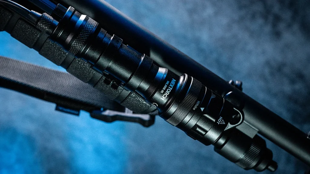 A light is not optional. You cannot index a threat you cannot see. If you don’t have one on the gun itself you need to have some ambient light in your house and on the property itself. Out front, this 590 uses a Nextorch WL50B IR head unit with a momentary switch. Nextorch is known for building reliable weapon lights. The WL50B operates on CR123A cells or its rechargeable proprietary battery and capable lumen output is listed at 1000 lumens on high. It also produces IR output in its configuration, which may be useful in some setups and unnecessary in others. If you do not intend to use IR, select the white-light only option to avoid complexity.