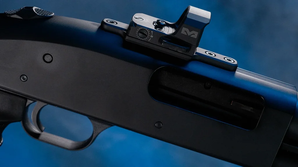 Sighting choices should favor fast target acquisition and redundancy. On the 590 I mounted a Meprolight MPO DF. It is an RMR footprint red dot running on a CR1623 battery with a stated runtime of 15,000 hours. The DF’s purpose-built baseplate allowed an almost co-witness setup with the front bead, giving an optical fast-aiming solution while keeping a visible backup.