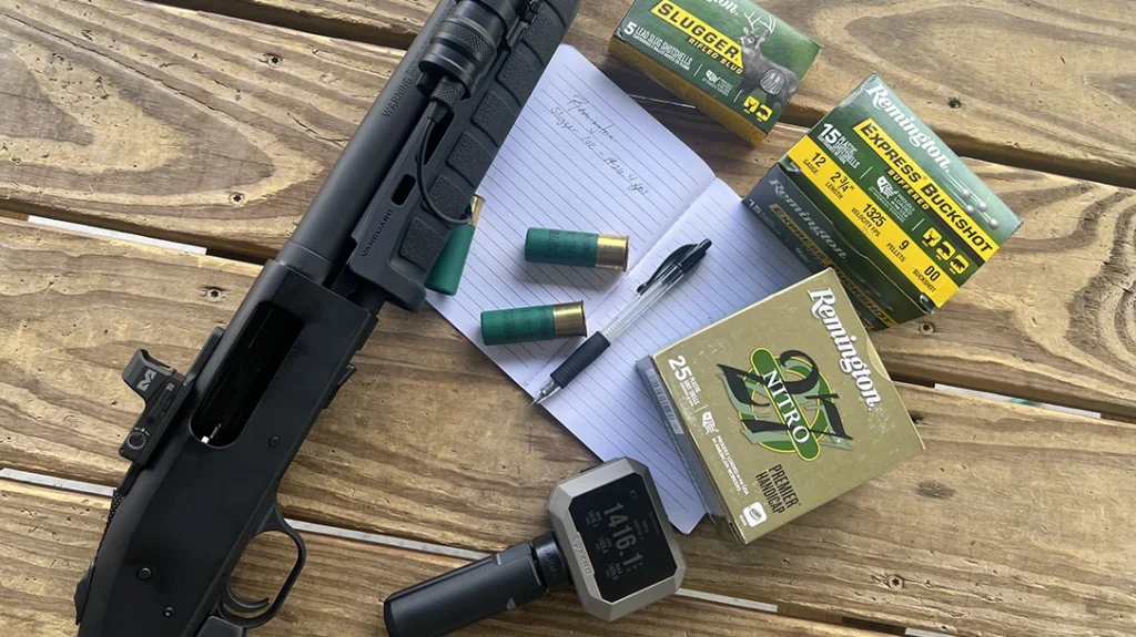 In this build I tested Remington 00 Buck, which the data in this example reported as a nine-pellet packet at 1325 fps. Treat manufacturer and test data critically and test it on your own. I also tested Remington Rifled Slugger slugs through this 590. The gun is not fitted with a choke and is intended to run buck and ball. A rifled slug placed carefully from a smoothbore barrel shot a 1oz slug that averaged 1,416.1 fps over five shots in my testing. The Slugger easily hit a 9 in steel plate out to 50 yards, which demonstrates why slugs have utility when you need reach. Conversely, light birdshot like Nitro 27 is not ideal for defensive work; it has minimal recoil and cycles actions nicely for testing, but its wound potential and penetration patterns are designed for sport, not stopping threats.