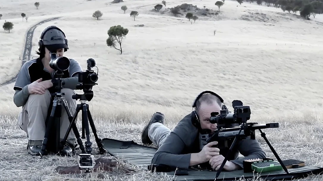 To hit the 24 x 24 inch target 3,018 yards, Mark and Sam are using a modified bolt-action rifle that’s built around a Howa 1500 long action and a modern .303 British barrel complete with a massive brake. The barreled action is bedded to an MDT Oryx chassis.