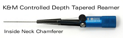 K&M makes a depth-adjustable, inside-neck chamferer (“Controlled Depth Tapered Reaper”) with ultra-sharp cutting flutes. The latest version, which costs $64.40 at KMShooting.com, features a central pin that indexes via the flash hole to keep the cutter centered. In addition, the tool has a newly-designed handle, improved depth-stop fingers, plus a new set-screw adjustment for precise cutter depth control. We caution, even with all the depth-control features, if you are not careful, it is easy to over-cut, slicing away too much brass and basically ruining your neck. We think that most reloaders will get better results using a more conventional chamfer tool, such as the Forster or Redding 15-P.