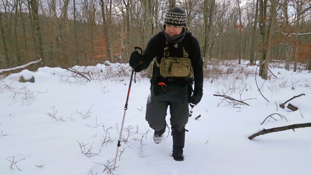 The author on the trail during a winter hike to camp wearing the Easy Wind Outfitters Overlook Hiking Socks.