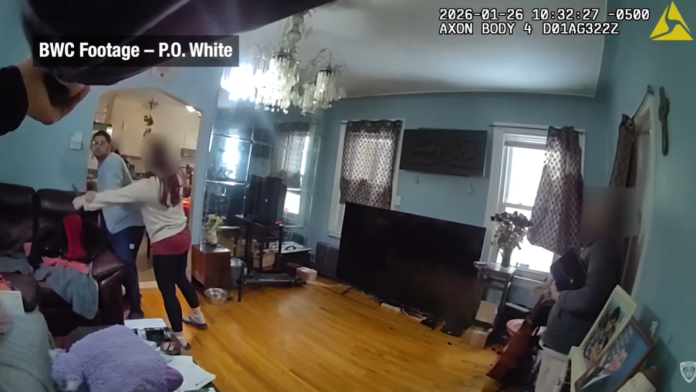 After being greeted by a woman at the home, the video shows White passing through a glass-paned door separating a vestibule area from the living room. Chakraborty immediately grabs a knife in the kitchen and starts moving straight toward the officer.