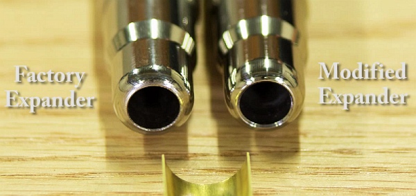 Tip: When loading pistol brass with a progressive press, sometime the powder-through expander is hard to remove, especially with short cases. There are two fixes — first, try deburring the inside of the case mouth on your cases. Second, the radius of the powder through expander plug can be modified to smooth entry and exit (see photo). Starline will do this modification for free.