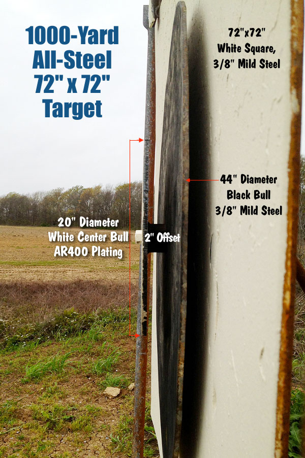 Rick tells us: “Here’s the deal — everything is steel! The large plate is 72″x72″ and the black bull is 44″ diameter. The 20″-diameter central white bull is made from 1/2″-thick AR400 bull-dozer plating. That’s the same size as the regulation Palma/Creedmoor paper target. The white square and black bull are 3/8″-thick mild steel. Plates are off-set 2″ from each other. I welded a 2″ length of square tubing to the back of both plates and the bolt slides through and is attached to the large plate. I used 2 3/8″ upset tubing (oil field pipe) for the holder framing.” Rick says he invested about $1000.00 in metal for the target, but that was 15 years ago. Today the steel would be much more expensive.