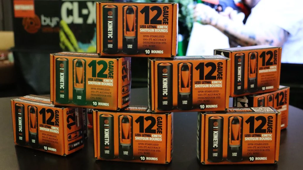 Less lethal options do not necessarily mean a dedicated launcher system. 12-gauge shotguns are popular for personal protection due to the sheer variety of ammunitions available. That includes less-lethal rounds like rubber buckshot and slugs. Byrna also has a solution for the conventional 12 gauge shotgun with the Kinetic Less Lethal Shell.