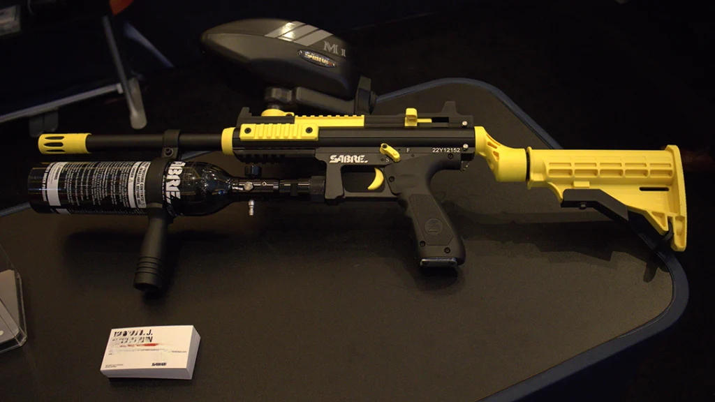 Unlike the pistol model, the new long gun model does not rely on a small C02 cartridge in the pistol grip, but a larger tank mounted under the barrel. The launcher comes with a handguard with side and top Picatinny rails for mounting lights and optics for precise threat identification and targeting. In addition, the new Sabre launcher is equipped with an AR-like safety and charging handle, as well as a telescoping buttstock.