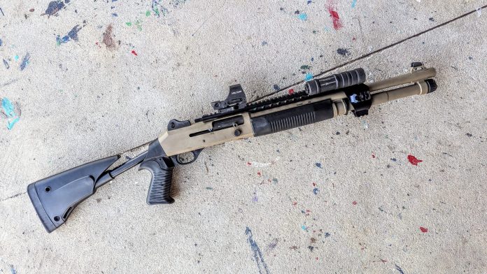 In the whole wide world of YouTube, there isn’t a video on the Benelli M4 version, either. My first problem was: how the hell does this slide onto the gun? It doesn’t seem to fit, and it turns out it goes over the front of the gun with a little careful twisting and prying.