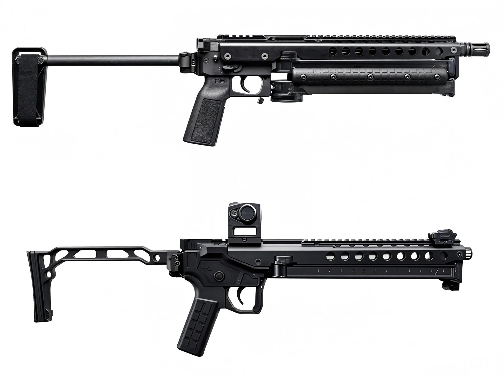 Well, if you’ve seen the ST50 floating around since early last year on social media, then you pretty much know what the KP50 is. It essentially takes the barreled action of the P50 and flips it upside down so that the mag is much more accessible and lows from below. No more opening up a clam shell to do mag changes. It also uses an AR pattern grip and can accept a brace or a stock. It feels like an entirely different, and better gun. Mag changes are dramatically easier and faster.