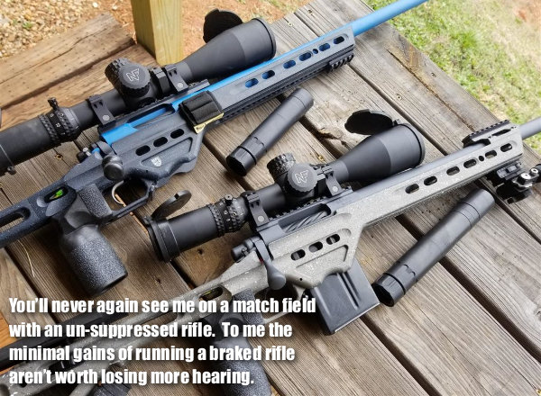 My hearing is something I value and will do everything to protect from this point forward. You’ll never again see me on a match field with an un-suppressed rifle. To me the minimal gains of running a braked rifle aren’t worth losing more hearing.