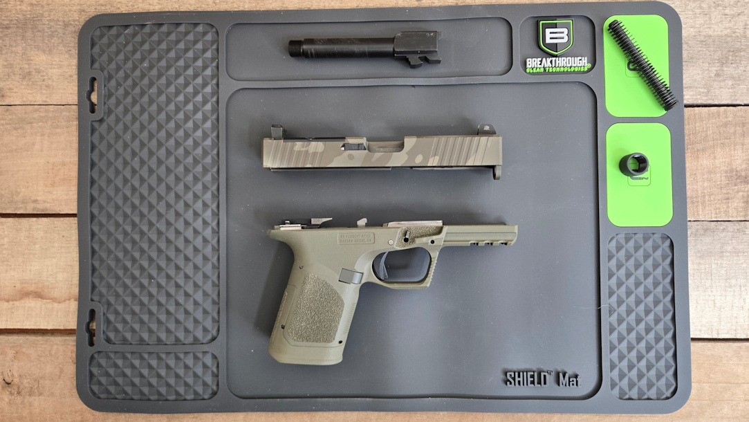 The handgun sized 18×12 inch SHIELD Mat from Breakthrough Clean Technologies is a durable, heavy-duty PVC mat designed for handgun maintenance. It features molded textured compartments to organize and contain components and tools, and a universal size that fits most handguns. It protects both your work area and your firearm from damage when you’re cleaning your guns or doing maintenance. The surface is easy to clean, too.