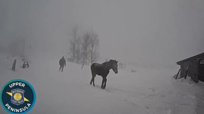 SAULT STE. MARIE, Mich. — A horse escaped from its home and ran about a mile down a state highway during a blizzard Monday before state troopers gave it a “police escort” to a barn.