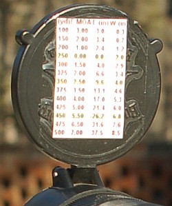 Another option is to place your ballistics card on the back of the front flip-up scope cover. This set-up is used by Forum member Greg C. (aka “Rem40X”). With your ‘come-up’ table on the flip-up cover you can check your windage and elevation drops easily without having to move out of shooting position.