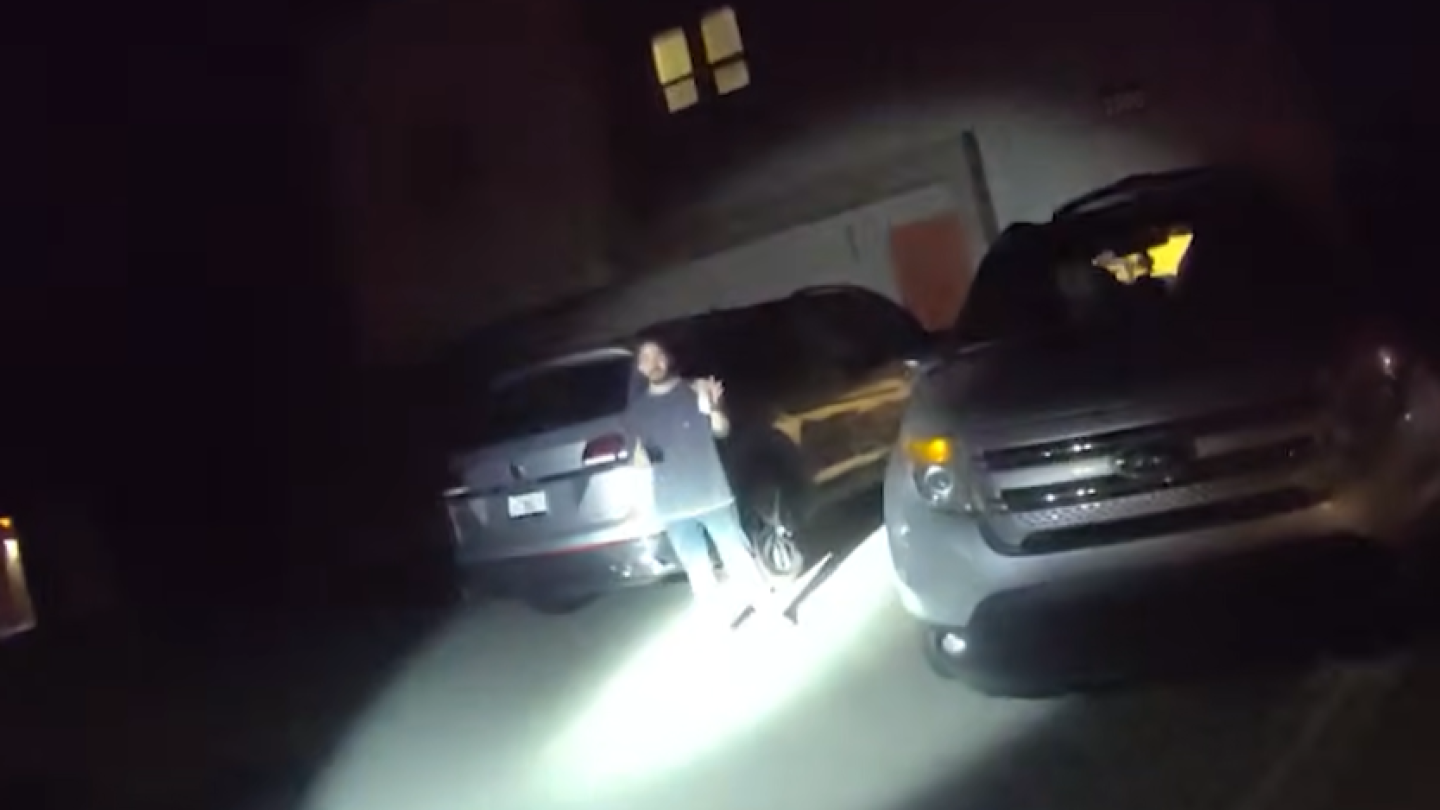 Two officers were seen on body-worn camera speaking with the suspect’s wife about a domestic dispute when the suspect appeared nearby. Officers asked whether he was armed.