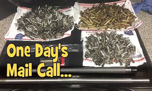 Kevin’s caption: “It only gets worse. Mail Call today: 20″ .308 Ballistics Advantage barrel, 26″ Savage 25-06 barrel, 700 pieces of .38 special, 300 pieces of .357 magnum, 500 pieces .308 Win, gas tube, Hornady Modified Case Gauge. I have more crap on the way too.”