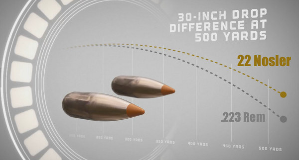 Approaching 22-250 velocities in a much smaller package the 22 Nosler yields 25% more case capacity than the .223 Rem/5.56 NATO, resulting in 14% more velocity and 30% more energy at the muzzle.