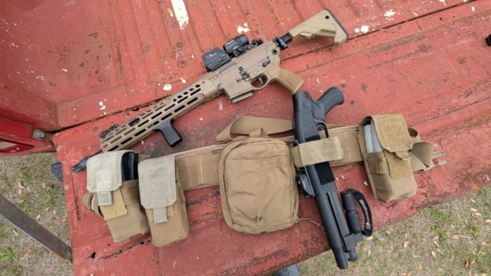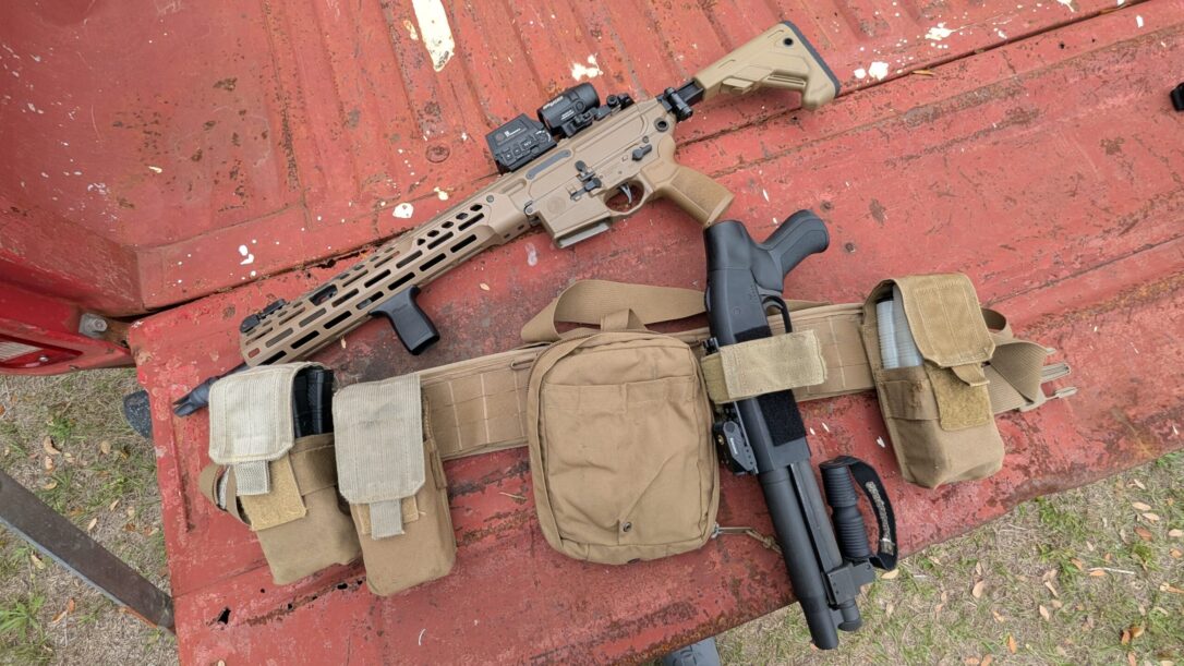 For fun, I attached a FSBE weapon catch that holds my Mossberg Compact Cruiser AOW nicely. Six mags of 5.56 and a mini 12 gauge shotgun are a lot of weight for a belt. Too much if I wasn’t using the suspenders. However, with the belt tight and the suspenders adjusted correctly, it is perfectly stable.