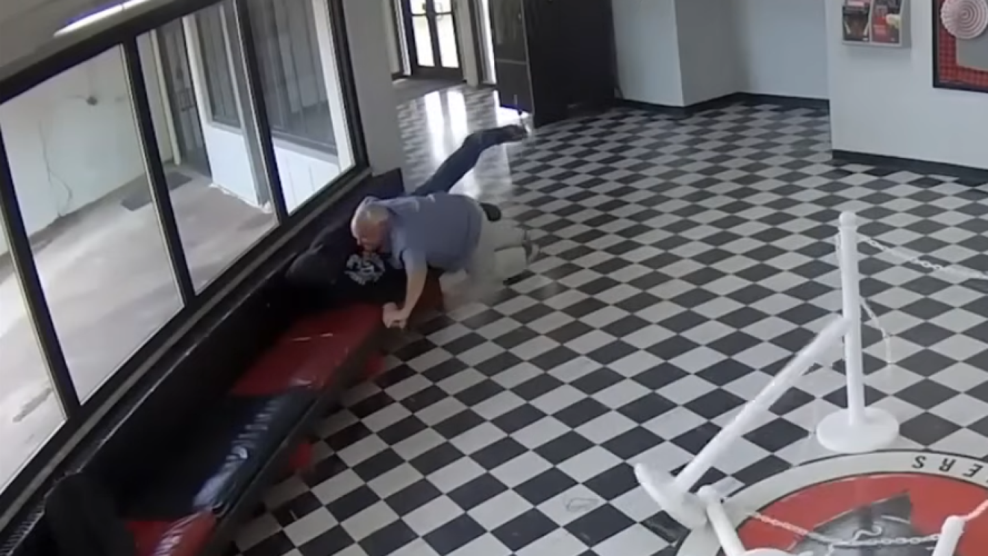 Video shows him grabbing Hawkins’s hand, causing him to drop the gun to the floor as he forced him onto a seat. Another person can be seen kicking the gun away.
