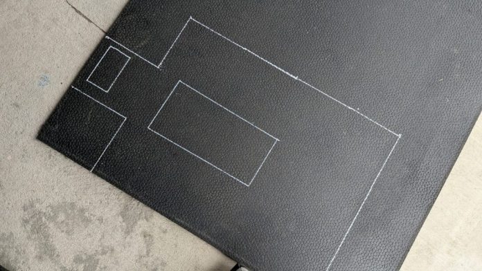 With the outline down, I brought out the razor knife and started cutting. This was a real pain in the butt. The half-inch-thick mat was tough and didn’t cut easily on the ground. I moved it to a workbench and let portions of it hang off the bench, which meant gravity pulled at the previously cut portions. This made it easier to finish those cuts.