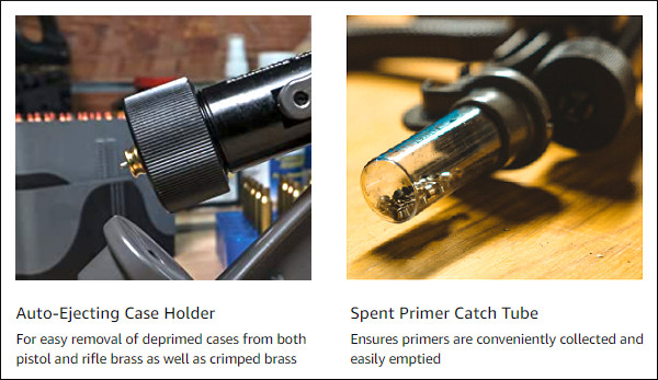 This handy depriming tool is very versatile. With a universal, cylinder-style cartridge-holder, the tool can deprime a wide variety of cartridge types from .20 caliber up to .338 caliber. Three different plastic collets are provided to handle for different diameter cases. Spent primers are captured in a removable spent primer catch tube. Simply twist off the clear catch tube to dump the spent primers. With die-cast metal construction, this tool should last through many thousands of depriming cycles. MSRP is $65.99. Right now it is $47.99 on Amazon with 82% 5-star ratings.