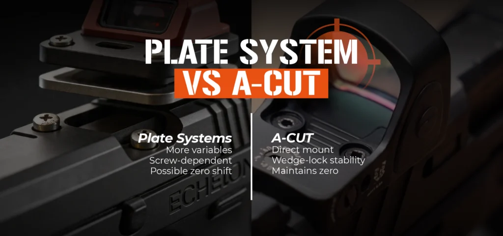 For shooters who put serious round counts downrange, zero retention becomes a real concern. The A-CUT’s wedge-locking system is rated to 40,000 rounds and handles recoil forces better than traditional screw-mounted plates over the long haul.